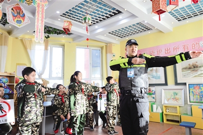 1月5日,呼和浩特市交管支队玉泉大队民警在五塔寺东街小学指导学生学习交通指挥手势。随着寒假来临,该校开展了“安全记心头 快乐度寒假”主题教育活动,通过知识展板、实物、游戏互动的方式,民警向学生们普及交通安全、防疫及安全用电等方面的知识,强化学生安全意识,提高自救能力。