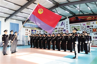 “对党忠诚、服务人民、执法公正、纪律严明……”1月4日,为迎接第二个“中国人民警察节”,锡林浩特铁路公安处组织开展集体唱警歌、重温入警誓词活动,全体干部民警面向警旗,高举右拳,庄严宣誓。摄影/北方新报正北方网首席记者 刘晓君