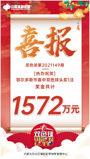 当晚,中国福利彩票双色球游戏进行第2021149期开奖,当期全国开出8注一等奖,单注奖金786万多元,其中2注为一等奖特别奖,单注奖金为1572万多元(含派奖786万多元)。其中我区彩民揽获1注双色球头奖。大奖出自内蒙古鄂尔多斯市乌审旗第15276747号福彩销售站。据检索,中奖彩民采用复式9+1的投注方式,揽获当期一等奖1注,一等奖特别奖1注以及其他各项奖级,共计揽获总奖金1579万多元。当然好运不仅于此,双色球游戏被称作大奖制造机,双色球二等奖也战果颇丰,当晚双色球游戏还开出二等奖103注,单注金额27万多元。其中,我区幸运中出3注二等奖,分别花落呼和浩特市第7314号福彩销售站(2注)和通辽市第5028号福彩销售站(1注),再次恭喜以上中奖彩民以及中奖销售站。
