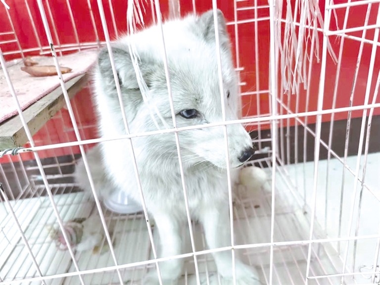 民警赶到现场时,市场内的商户已将这只白色的小狐狸抓获,并安放在一个小笼子内(如图),笼子内的狐狸看起来很温顺。商户们介绍,当天一早,他们发现这只不同寻常的小动物在市场内的街道上乱窜,起初他们以为是小狗,后来仔细观察,感觉像是狐狸,为了避免狐狸伤人,商户们将其抓住。