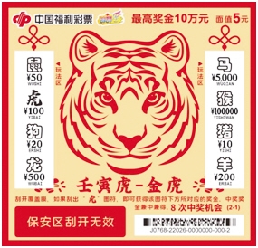 “壬寅虎——金虎银虎”采用了传统剪纸中的老虎形象,同时以金银双色搭配喜庆的红色,为广大购彩者在新的一年里送来满满的喜气与福气。此款即开票面值5元,最高奖金10万元。