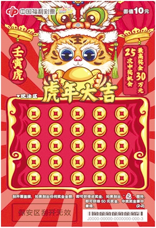 “壬寅虎——虎年大吉”中以复古插画风格描绘出两只萌虎怀抱金玉,头戴中国传统的戏剧和舞狮文化服饰,增加节日喜庆气氛,祝您虎年大吉大利,招财进宝!此款即开票面值10元,最高奖金30万元。