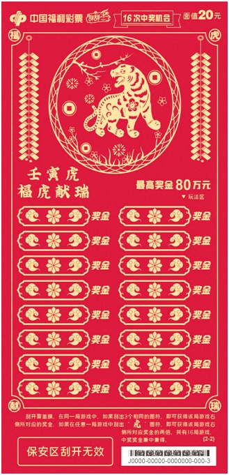 “壬寅虎——福虎献瑞”以中国正红为背景,用金黄色线条剪印出两只福虎弄春场景,代表财运的金色与代表好运的红色相结合,象征着在新的一年里,广大购彩者财源滚滚,好运连连。此款即开票面值20元,最高可中80万元大奖。
