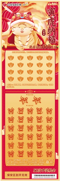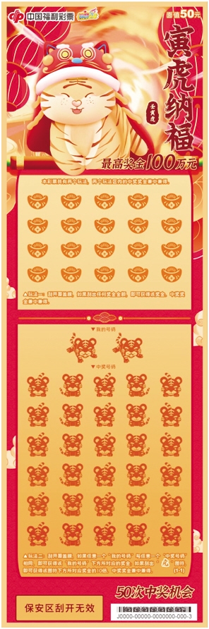 “壬寅虎——寅虎纳福”中以卡通动画形式呈现一只憨态可掬的小老虎,画面生动有趣,为您的虎年增福纳彩,也祝您在新的一年八方来财,笑口常开。此款即开票面值50元,最高可中100万元。