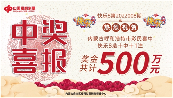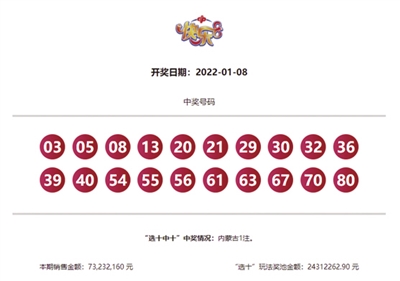 1月8日晚,中国福利彩票快乐8游戏第2022008期开奖,开出的中奖号码为“03、05、08、13、20、21、29、30、32、36、39、40、54、55、56、61、63、67、70、80”。当期,全国共诞出 “选十中十”大奖1注,单注奖金500万元。我区呼和浩特市彩民幸运摘得头奖,大奖出自呼和浩特市玉泉区小黑河村第15016422号福彩销售站。这是当期全国中出的唯一一注快乐8 “选十中十”大奖,也是2022新年伊始我区中出的第2注快乐8“选十中十”。