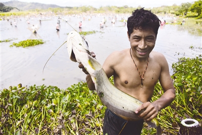 1月13日,在印度阿萨姆邦高哈蒂一处村庄,一名当地村民手捧大鱼。当日,村民参加捕鱼活动,庆祝收获季的结束。(据新华社报道)