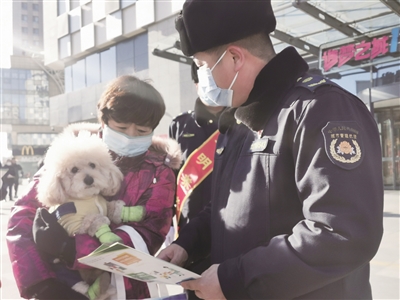 “您好,您的爱犬没有牵绳……”活动现场,工作人员发现一位女士正在无绳遛狗,赶紧上前进行宣传,提醒这名女士遛狗需牵绳,平时随身携带粪便清理工具,并送去相关宣传单和环保袋,这名女士马上将小狗抱起来,表示今后会文明养犬。