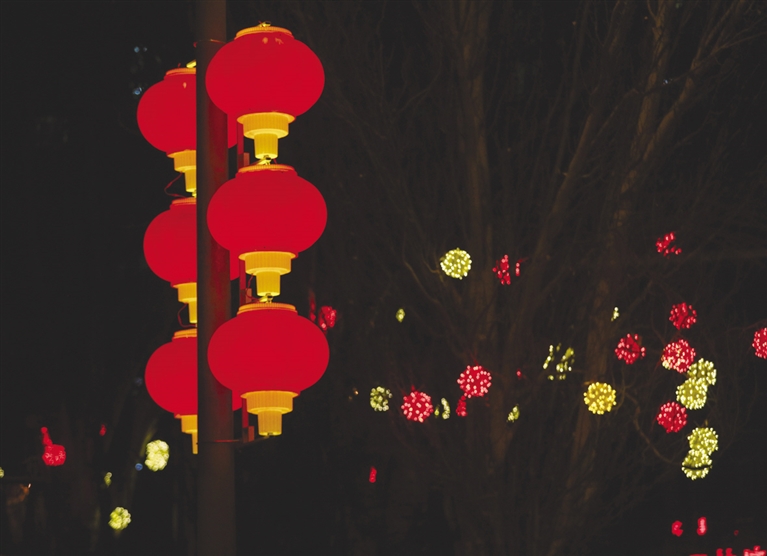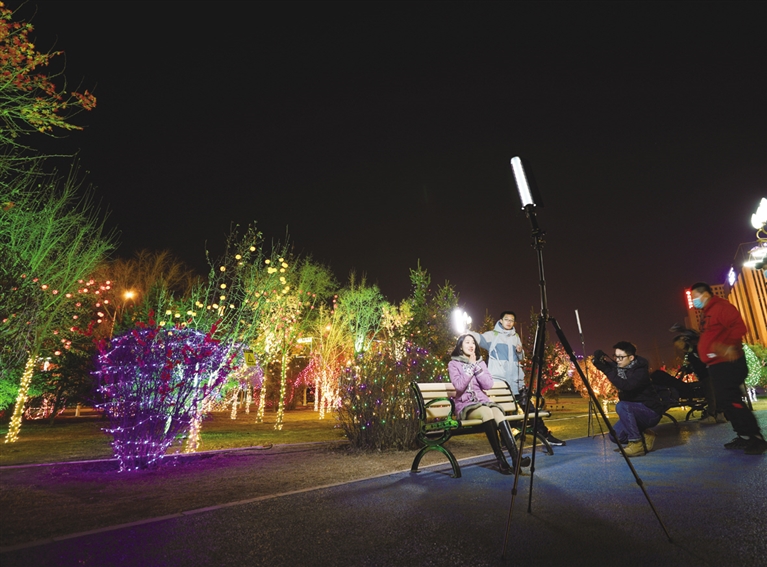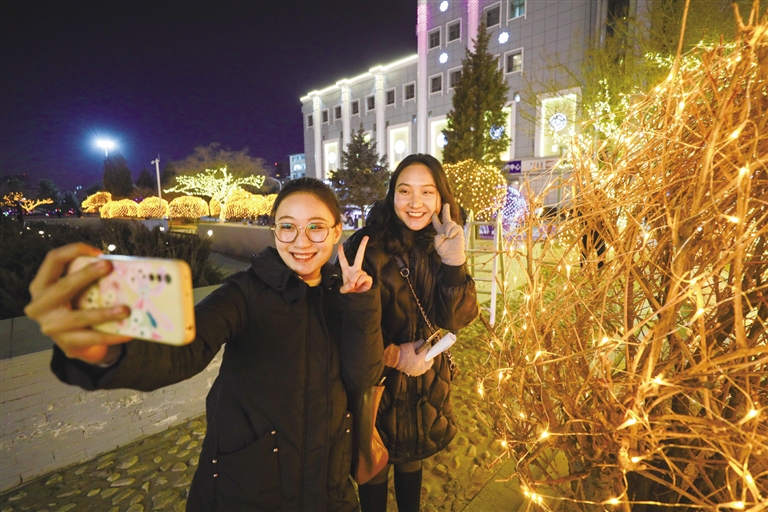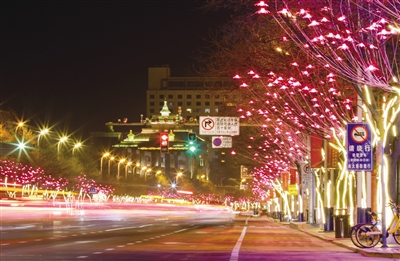玉泉区大南街华灯初上,流光溢彩,市民走在街头就感受到节日来临的喜庆气氛,整条街树上挂满了彩灯,各色灯光规律地变化着、闪烁着。走在呼和浩特的大街小巷,就能看到道路两边的灯杆和树体上工人们正在忙碌地悬挂红灯笼,造型各异的中国结和LED串灯也亮相街头,色彩斑斓,使不同的街道呈现出不同艺术特色。在敕勒川大街上也是灯光璀璨,美不胜收。在草原丝绸之路文化主题公园内,美丽迷人的夜景吸引着市民前来拍摄短视频,伴随着彩灯的点亮,公园内变成了一个美轮美奂、火树银花的光影世界。