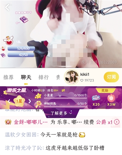 虎牙直播间中,“3D进来睡觉”“隔壁王姐姐”“达西小乖乖”等多个主播同样衣着暴露、言语轻佻,有的主播并不露脸,只将镜头对准胸部或者大腿,做出很多色情的动作,发出难以描述的呻吟声,当看到有人送礼物,就立刻对着镜头飞吻。一些网友大呼辣眼睛:“这么低俗,再这样我报警了!”