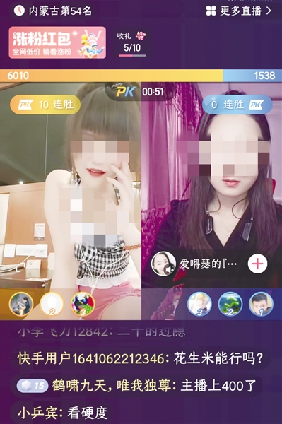1月11日,记者在快手直播平台看到,鄂尔多斯市的主播@单身宝宝618和酷妹莉莉615在直播时穿着裸露,言语低俗,被网友调侃后破口大骂。呼伦贝尔市主播@上善若水直播时穿着暴露,在与其他主播PK时,多次比划性暗示手势,甚至辱骂对方主播。1月13日零时许,在快手平台内蒙古同城排名第54名的一场直播PK中,女主播衣着暴露,言语挑逗露骨。