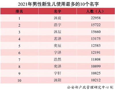 2021年出生并已经进行户籍登记的男性新生儿中,使用频率最高的10个名字依次为:沐宸、浩宇、沐辰、茗泽、奕辰、宇泽、浩然、奕泽、宇轩、沐阳。与2020年相比,除浩宇、奕辰、宇轩外,其余名字首次进入前十,其中“沐宸”使用人数达到2.3万,登顶榜首,成为男性新生儿名字首选。