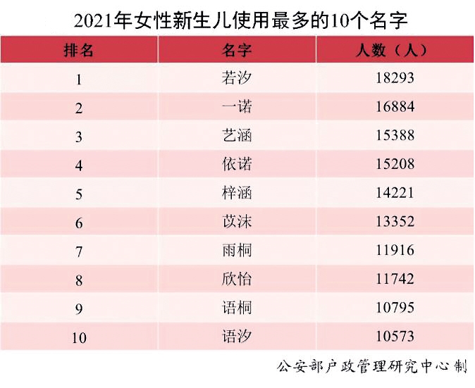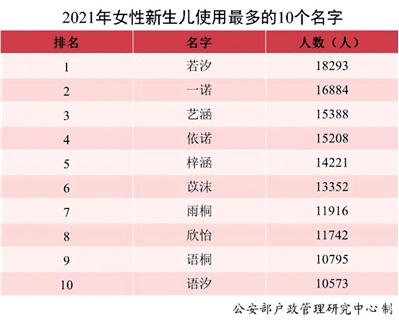 2021年出生并已经进行户籍登记的女性新生儿中,使用频率最高的10个名字依次为:若汐、一诺、艺涵、依诺、梓涵、苡沫、雨桐、欣怡、语桐、语汐。与2020年相比,若汐、艺涵、苡沫首次进入前十,其中“若汐”使用人数达到1.8万,登顶榜首,成为女性新生儿名字首选。