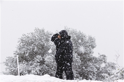 1月24日,在希腊雅典,一对情侣在雪中拥吻。希腊全国当日迎来大范围暴风雪天气。(据新华社报道)