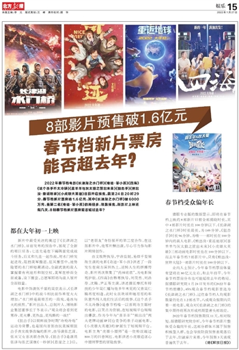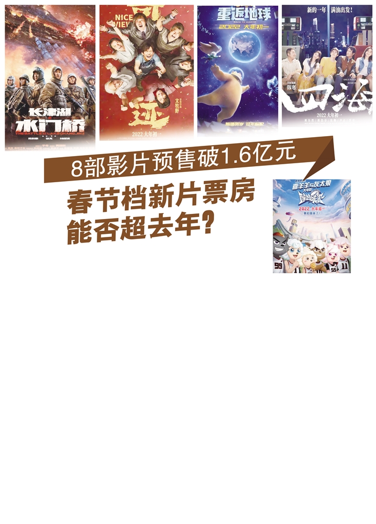 2022年春节档电影《长津湖之水门桥》《奇迹·笨小孩》《四海》《这个杀手不太冷静》《喜羊羊与灰太狼之筐出未来》《狙击手》《熊出没·重返地球》《小虎墩大英雄》日前开启预售。截至24日20时29分,春节档新片票房逾1.6亿元,其中《长津湖之水门桥》破6000万元,是第二名《奇迹·笨小孩》的两倍多,领跑预售。距影片上映还有几天,8部春节档新片票房能否超过去年?