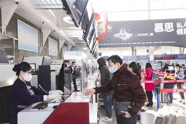 1月25日,呼和浩特白塔国际机场内,旅客们正在有序办理值机,安检处的旅客们自觉配合防疫工作,主动出示健康码和48小时核酸检测。记者看到,为了给广大旅客营造安心舒适的乘机环境,机场航站楼以新年和冬奥会为主题,提前布置楼内各区域景观,营造了浓郁节日氛围。