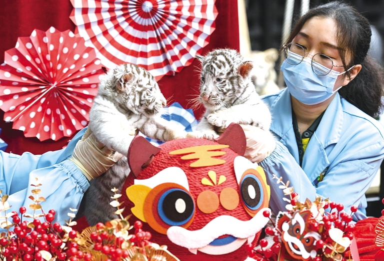 当日,广州长隆野生动物世界新生的一对白虎龙凤胎幼崽正式与游客见面。这对白虎龙凤胎于2021年12月6日出生。在长隆动物研究专家和保育员的悉心照料下,白虎宝宝身体愈加强壮。摄影/新华社记者 刘大伟