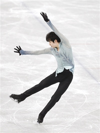 9时15分比赛正式开始。中国选手金博洋第五个出场。“天天加油!”“中国加油!”,身穿水蓝色比赛服的金博洋一亮相,现场观众就开始热情地呼喊着他的昵称,为他加油鼓劲。配乐响起,是平昌冬奥会上他曾经使用过的《卧虎藏龙》。帅气的中国功夫亮相后,金博洋顺利完成开场四周跳。战鼓响起,金博洋动作越发轻盈,宛如一名果敢又充满柔情的侠士,将四周勾手跳接三周后外点冰、阿克塞尔三周等高难度动作演绎得风生水起,最终获得90.98分的高分,顺利晋级接下来的自由滑比赛。出色完成全部动作后,金博洋也显得十分激动,眼含热泪和教练紧紧拥抱在一起。