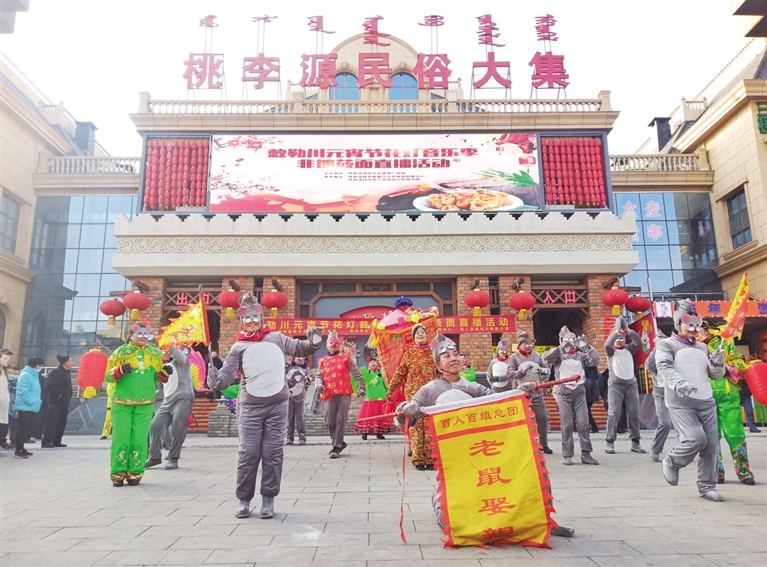 在现场,呼和浩特百人百组乌兰牧骑总团的文艺志愿者们表演了“老鼠娶媳妇”“空竹舞龙”、扭秧歌等社火表演,为老百姓送上新春祝福。
