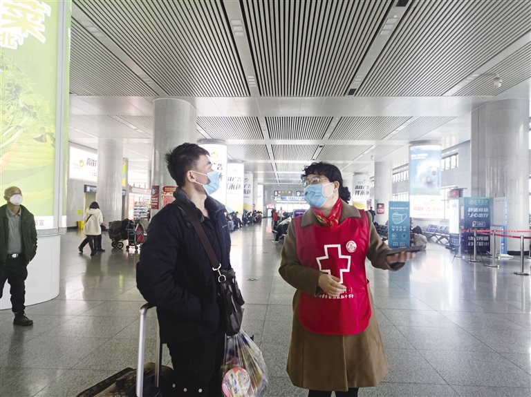 饶巧丽的女儿靳月明在韩国读大学,因为疫情,去年暑假回国后一直在家中上网课,业余时间跟着妈妈一起做公益,当过疫苗接种志愿者、核酸检测志愿者、应急救护培训志愿者。今年寒假她第一次加入到春运志愿者行列,成为一名光荣的红十字应急救护员。虽然和妈妈在一个服务点,母女俩却没有被安排在一个工作时间。没有了妈妈的关照,靳月明感觉自己成长得很快,除了可以为旅客提供应急救护咨询服务,她还帮着行动不便的旅客拿包裹、指引检票口等服务,将捡到的学生证、身份证第一时间物归原主。服务期间靳月明听到最多的暖心话是“谢谢你,姑娘。”这让她很有成就感。