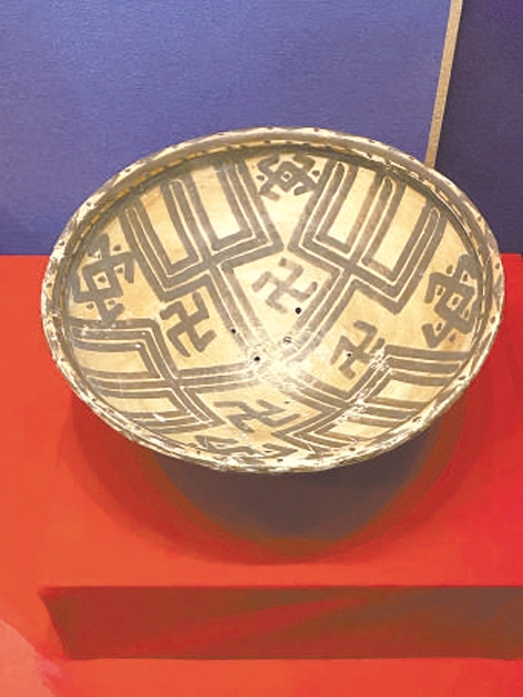 “卍”(wàn)字是中国福寿文化里最常见的符号之一。前段时间,在北京颐和园博物馆举办的“福寿文化与艺术特展”上展出了两件带“卍”字纹(俗称“万字纹”)的古陶器,其一是新石器时代彩陶文物——马家窑文化马厂类型万字纹双耳瓮。这件文物出土于青海民和县马厂塬附近,距今已有约4000年历史。其二是火烧沟文化彩陶万字纹双耳豆,距今约3700年。