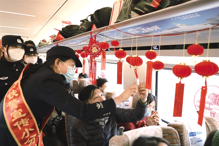 2月13日,在包头开往北京北的G2496次列车上,旅客通过扫码方式,参加猜“反诈灯谜”以及元宵节传统知识问答等活动。为提升返程旅客的安全意识,守护好自己的“钱袋子”,包头铁警在列车上开展了猜灯谜的现场互动,并送给大家防骗防盗宣传册。 摄影/北方新报正北方网见习记者 费 捷