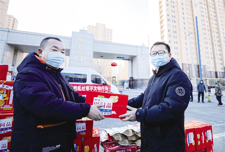 《北方新报》总经理陈曦照(右)向社区赠送慰问品