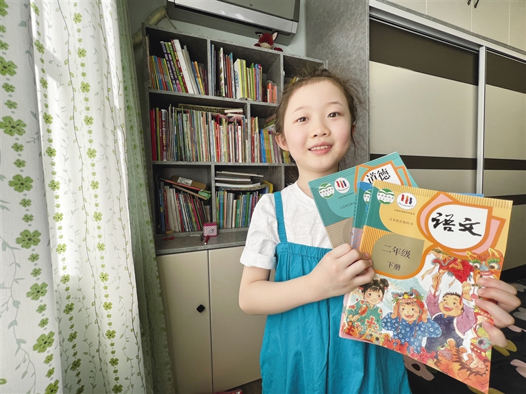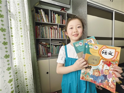 2月26日,一名小学生在家中展示刚刚收到的新课本。疫情期间,为最大限度地减少交叉感染,呼和浩特市新城区北垣小学等许多学校采取邮寄方式,将新学期教科书送到学生手中。