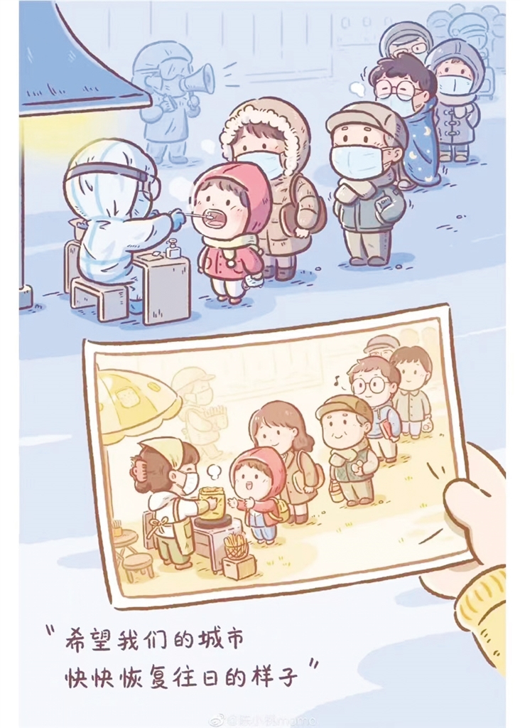 牙齿刷刷干净,脸蛋洗洗干净,穿上一件羽绒服,拿好身份证和手机,兴高采烈去做核检。一如生病了要去看医生。居然是满心欢喜的要看看今天是不是比昨天更好了。按照程序,先出示绿码进行登记,接着按序身份证拍照,然后“啊啊啊”张开嘴巴让核检“大白”取样,最后从志愿者手里领到凭证小圆贴。一个小姑娘抱着一大包暖宝宝一路小跑,塞到了绿码登记人员的怀里;一个小伙子搬来一个小凳子,递给志愿者和“大白”,让他们坐一坐;一位大娘从自己的位置上往后让着,说让上班的孩子们先核检;我集够四张小圆贴的时候,照常说谢谢,志愿者大哥说“不用谢我,要谢就谢谢咱伟大的祖国”,好腻歪的热爱啊……在排队中,流动着相互尊重、相互关怀、相互帮助、相互信任的暖洋洋。左邻右舍间的信任,“大白”和“小绿码”“小黄码”之间的信任,小家对国家的信任。