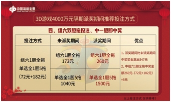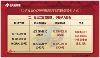 内蒙福彩回馈全区彩民朋友的3D游戏4000万大派奖活动已于2月15日精彩开启!本次活动预计40期的派奖活动,是内蒙古福彩3D游戏历史上最大规模派奖,派奖金额达到4000万元;返奖率最高可达78%;单选奖金最高可达1500元。如何在这精彩的派奖期间,赢取更多的惊喜呢?学会这7招,一定能让您在派奖期间,惊喜不断!