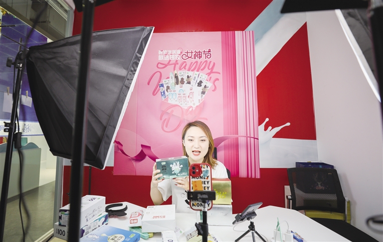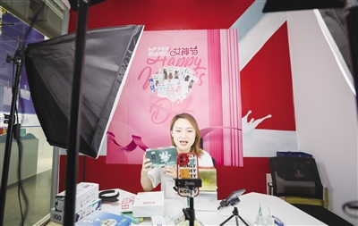 3月10日,在爱上内蒙古正能量网红孵化基地,主播正在直播带货。疫情期间,该基地在严格做好疫情防控的基础上,积极组织开展直播活动,保障居民在米面粮油、休闲零食等方面的基本供应,受到消费者欢迎。摄影/北方新报正北方网首席记者 牛天甲