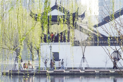 这是3月8日在南京莫愁湖公园拍摄的湖边垂柳。