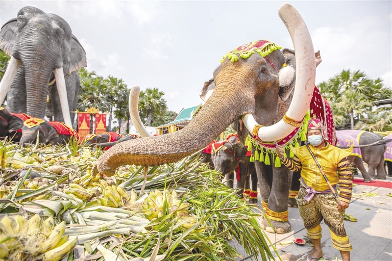 3月13日,大象享用自助餐。当日是泰国一年一度的大象日,泰国芭堤雅东芭乐园在这一天为大象奉上了丰盛的水果自助餐。摄影/新华社记者 王 腾