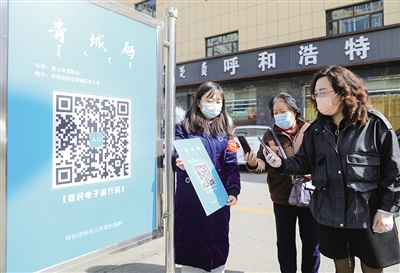 3月21日,呼和浩特市星火巷社区志愿者正在指导居民扫码出行。当日,呼和浩特市正式启用“青城码”,青城码整合了健康码、行程码、核酸检测、疫苗接种、青城警码等有关数据,实现一码查询、一码展示,减少群众扫码繁琐,方便群众亮码通行。 摄影/北方新报正北方网首席记者 牛天甲