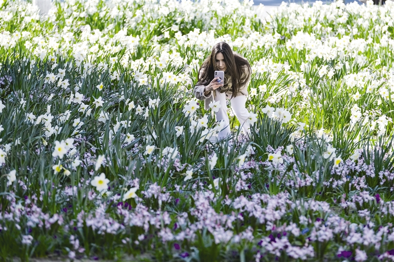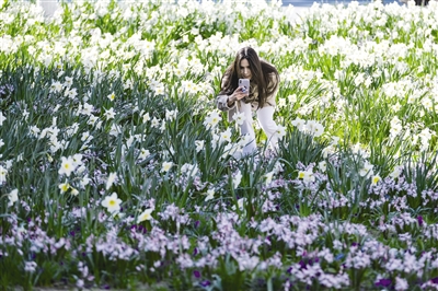 3月18日,在比利时布鲁塞尔,一名女子在花丛中拍照。春天的布鲁塞尔处处生机盎然,景色美不胜收。 摄影/新华社记者 张 铖