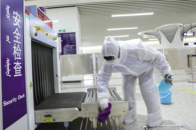在火车西站地铁站内,广播里不断提醒乘客佩戴口罩、出示青城码。防疫人员正对站内进行全面消毒、保洁和通风工作,确保卫生消杀不留死角、不留盲区。进站乘客在购票、候车时主动保持安全距离。“目前,地铁疫情防控工作有序开展,严格执行各项措施。地铁站内全天要进行6次以上消杀,公共设施全部消毒。为了避免人流密集,地铁也将随时增发车次。”呼和浩特市地铁运营有限公司客运中心呼和浩特站值班站长齐利强说。