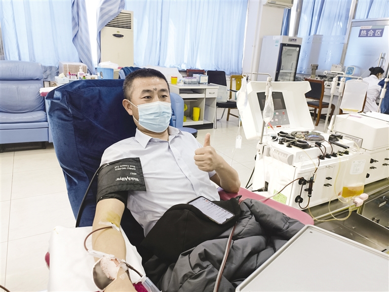 当天15时30分,记者在内蒙古自治区血液中心见到了正在捐献血小板的卢平业。卢平业是呼和浩特市房产交易中心的工作人员,2009年他在一次无偿献血时才意外得知自己是“熊猫血”,此后,只要有求助相同血型的人,他总会热心帮忙。