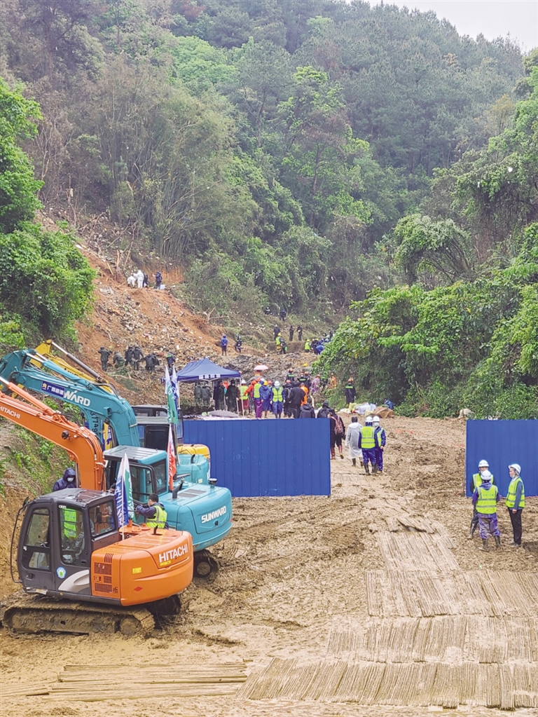 23日,受短时强降雨影响,事故核心区域形成了部分积水深坑,对事故调查和搜救工作造成了一定影响。记者看到,现场道路泥泞,脚踩在路上,会陷下去很深,前一日紧急开辟的一条通往事故核心现场的道路已经修通。