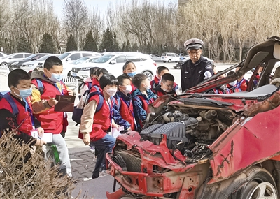 3月28日是第27个“全国中小学生安全教育日”,为加强中小学生的交通安全教育,3月26日、27日,巴彦淖尔市交管支队临河区大队联合学校、新闻媒体开展“知危险、会避险”主题活动,组织280多名小学生到大队参观体验,学习交通安全知识。图为民警以交通事故残骸车展台为学生们以案说法。 摄影/北方新报正北方网记者 白忠义