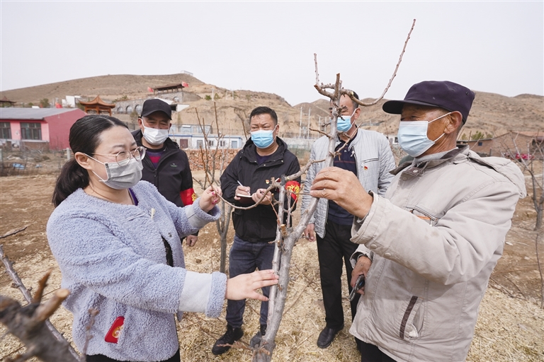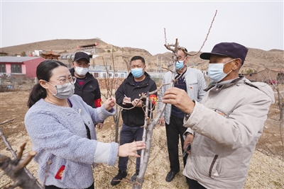3月28日,在赛罕区黄合少镇石人湾村,农技专家在给果农讲解果树防治病虫害知识。春耕备耕期间,呼和浩特市赛罕区黄合少镇邀请农技专家为果农讲解果树修剪、水肥管理及病虫害防治等方面的管理技术,促进增收致富。摄影/北方新报正北方网首席记者 牛天甲