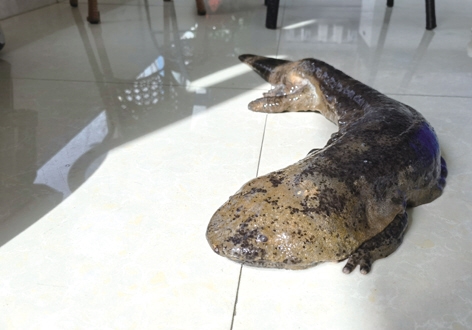 “当时我心下狐疑,这一带不应该有野生娃娃鱼啊,仔细一瞧,它受伤了,我担心它遭受二次伤害,便带回来暂养在店里。”崔先生告诉记者,他正在读初二的女儿学过娃娃鱼的相关知识,看到后也很惊讶,说娃娃鱼是国家二级保护动物,不能随便处置。