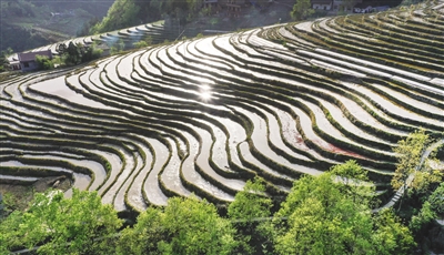 近日,在陕西省安康市岚皋县南宫山镇桂花村,因春灌备耕,沿山势自上而下层层铺叠的千亩梯田,仿佛戴上了一串串银链,构成了一幅优美的田园风光图。(据新华社报道)