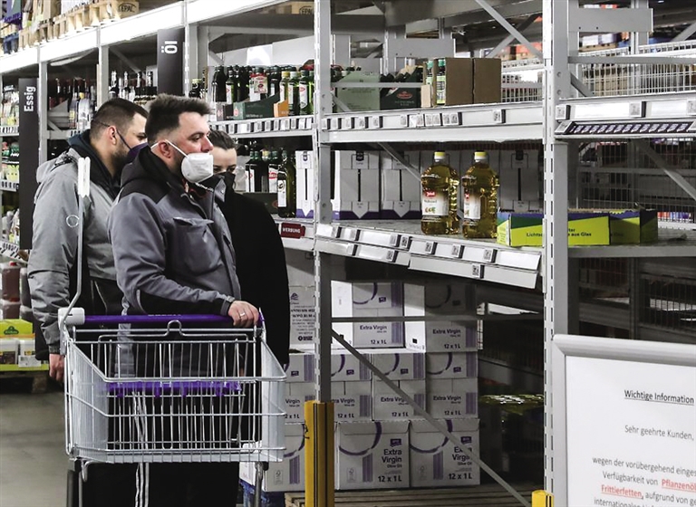 3月26日,在德国首都柏林的一家超市,顾客站在商品短缺的食用油货架前。随着西方不断升级对俄罗斯制裁,能源价格上涨也波及食品、日用品等与生活息息相关的领域。 摄影/新华社记者 高 静