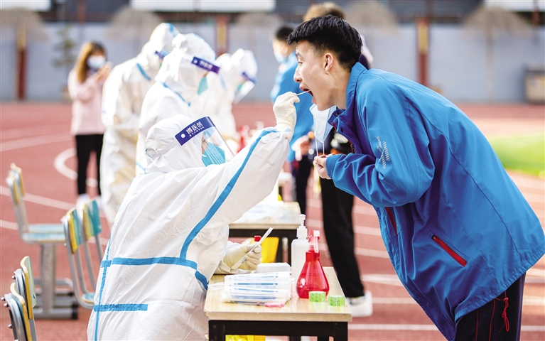 3月30日,呼和浩特市高三年级的学生正在有序进行核酸检测。当日,呼和浩特市启动高三年级教职工和学生的新冠肺炎核酸检测工作,为4月1日返校复课做好准备。