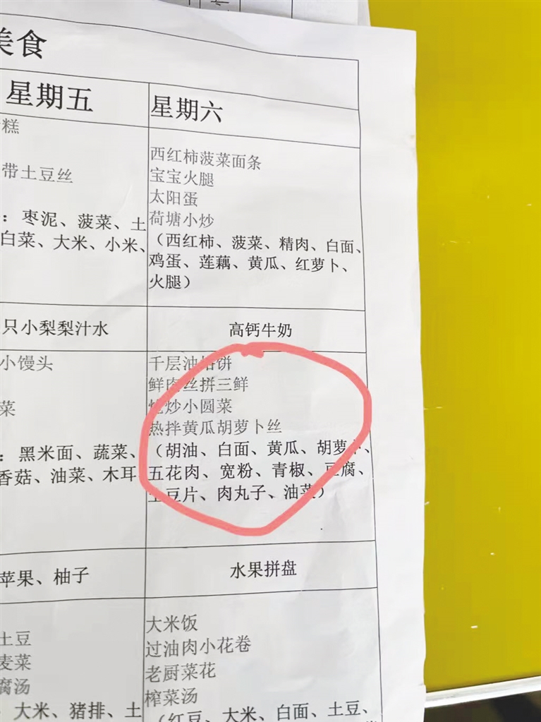 “4月2日,有家长发现佳泰幼儿园在给幼儿提供的午餐中有严重偷工减料行为。”4月3日,幼儿家长刘先生告诉记者,他的孩子在佳泰幼儿园中班学习。按照幼儿园给出的食谱,4月2日的午餐应该给孩子提供的是:高钙牛奶、千层油烙饼、鲜肉丝拼三鲜、炝炒小圆菜、热拌黄瓜胡萝卜丝。这些菜品的具体食材为:胡油、白面、黄瓜、胡萝卜、五花肉、宽粉、青椒、豆腐、土豆片、肉丸子、油菜。