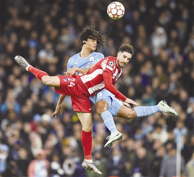 4月5日,曼城球员阿克(左)与马竞球员弗尔萨利科在比赛中争顶。当日,在欧冠1/4决赛首回合比赛中,英超曼城主场1:0战胜西甲马竞。(据新华社报道)