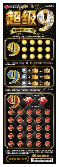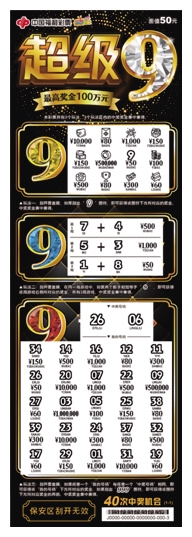 刮刮乐“超级9”,50元面值,采用组合玩法,分别为:即刮即中、数字相加、对数字三种玩法,共设置11个奖级,最高可中100万元!