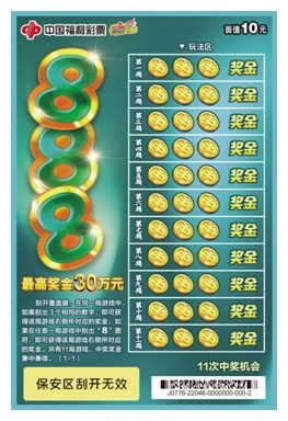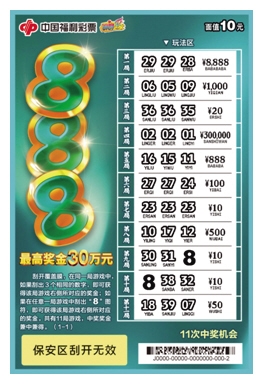 刮刮乐“888”,10元面值,采用经典的“分局三同图”玩法,共设置10个奖级,最高可中30万元!