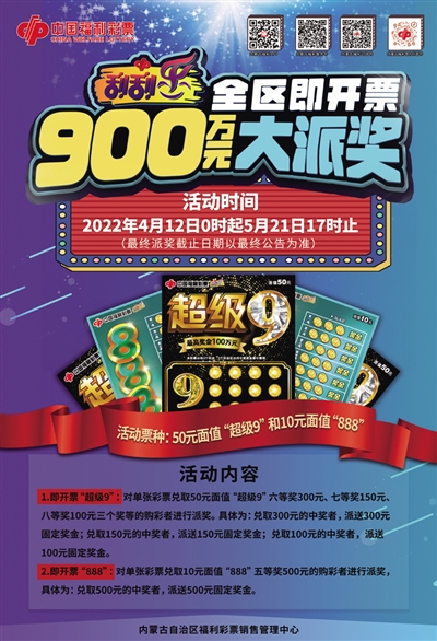 本次活动针对两种新上市的即开型福利彩票—50元面值“超级9”和10元面值“888”进行派奖,派奖总金额900万元,两款新票设计独特,玩法有趣,值得期待。