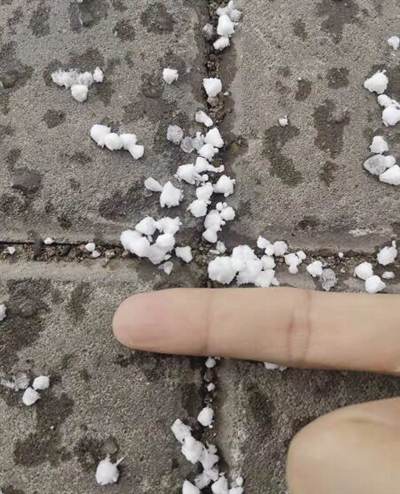 据了解,霰又称雪丸或软雹,由白色不透明的近似球状(有时呈圆锥形)的、有雪状结构的冰相粒子组成的固态降水,直径2~5毫米,着硬地常反跳,松脆易碎。霰是在高空中的水蒸气遇到冷空气凝结后降落的白色不透明小冰粒,多在下雪前或下雪时出现,有些地区叫雪子、雪糁等。