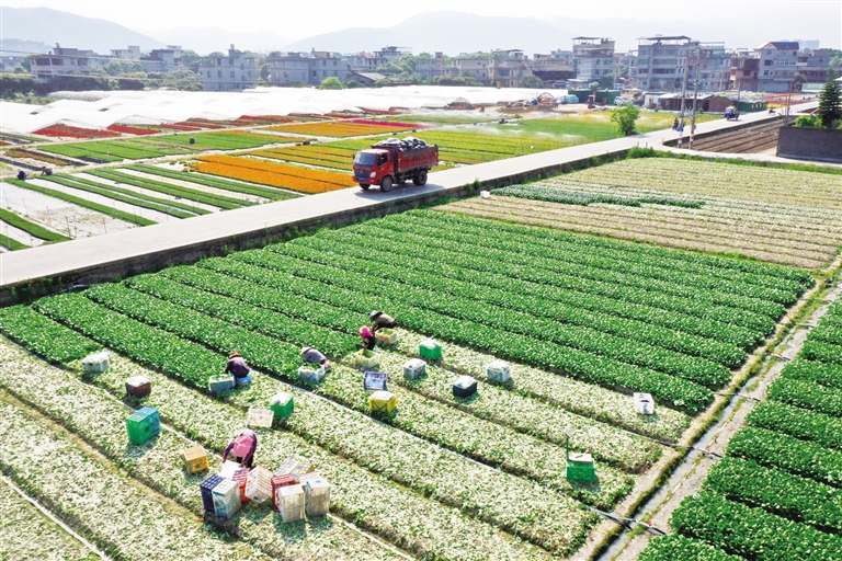 随着天气转暖,蔬菜、花卉生长旺盛,福建省福州市闽侯县南通镇蔬菜花卉种植基地迎来春种春收的繁忙时节。无人机俯瞰,一块块田地色彩缤纷,如同大地调色板。图为南通镇蔬菜花卉种植基地的菜农在收获蔬菜(无人机照片)。摄影/新华社记者 姜克红